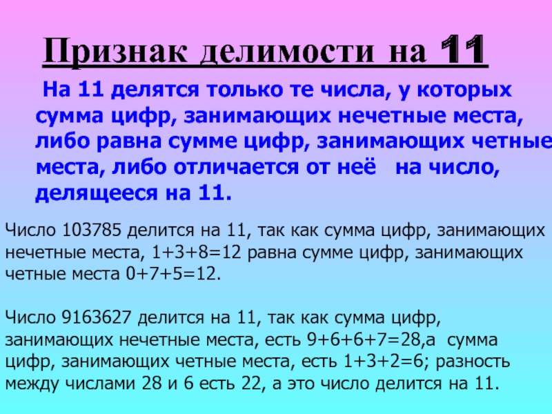 Число 9163627 делится на 11, так как сумма цифр, занимающих нечетные места, есть 9+6+6+7=28,а сумма цифр, занимающих четные места, есть 1+3+2=6; разность между числами 28 и 6 есть 22, а это число делится на 11.