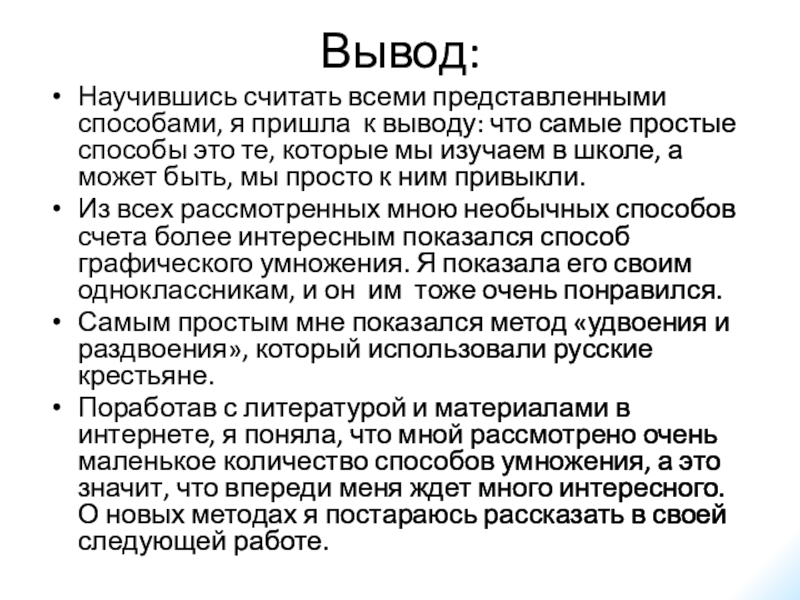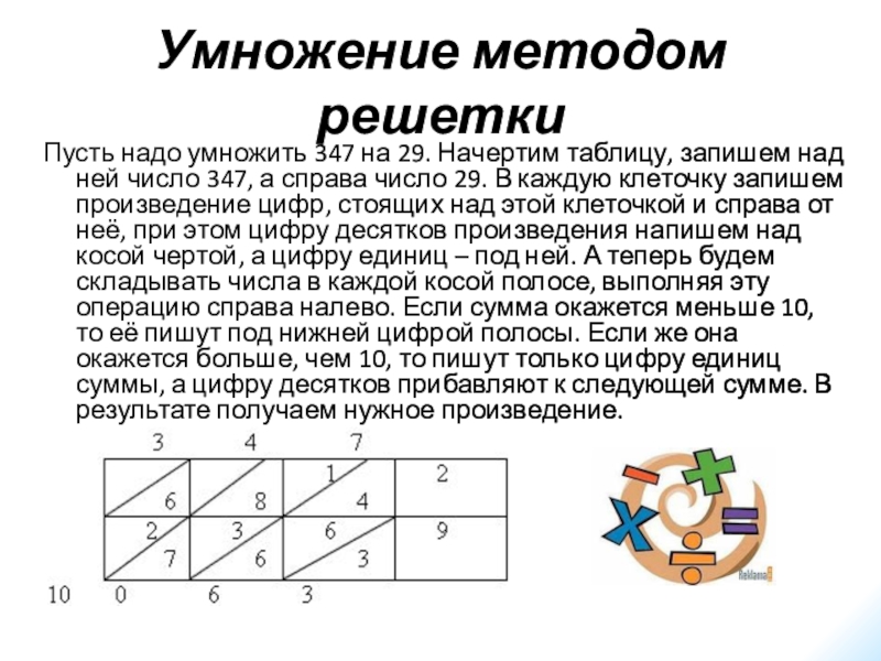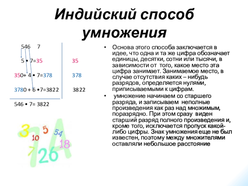 Основа этого способа заключается в идее, что одна и та же цифра обозначает единицы, десятки, сотни или тысячи, в зависимости от того, какое место эта цифра занимает. Занимаемое место, в случае отсутствия каких – нибудь разрядов, определяется нулями, приписываемыми к цифрам.