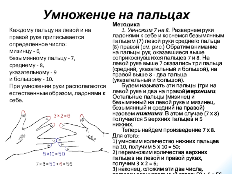 Каждому пальцу на левой и на правой руке приписывается определенное число: