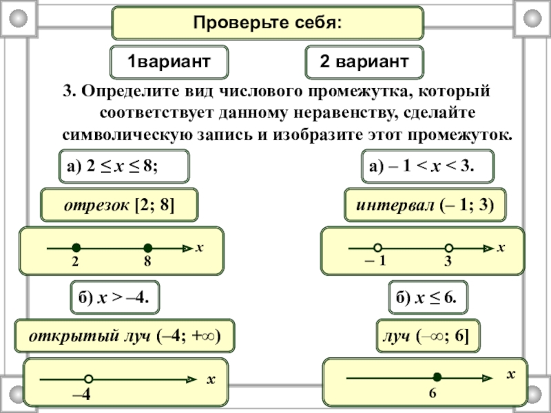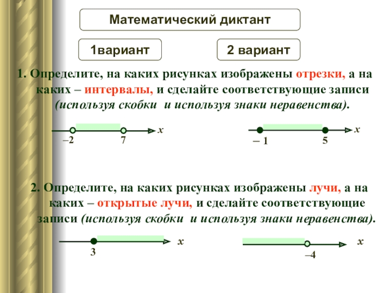 2. Определите, на каких рисунках изображены лучи, а на каких – открытые лучи, и сделайте соответствующие записи (используя скобки и используя знаки неравенства).
