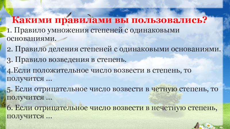 Какими правилами вы пользовались?1. Правило умножения степеней с одинаковыми основаниями.2. Правило деления степеней с одинаковыми основаниями.3.
