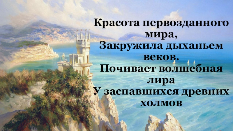Слайд 18Красота первозданного мира, Закружила дыханьем веков. Почивает волшебная лира У заспавшихся древних холмов
