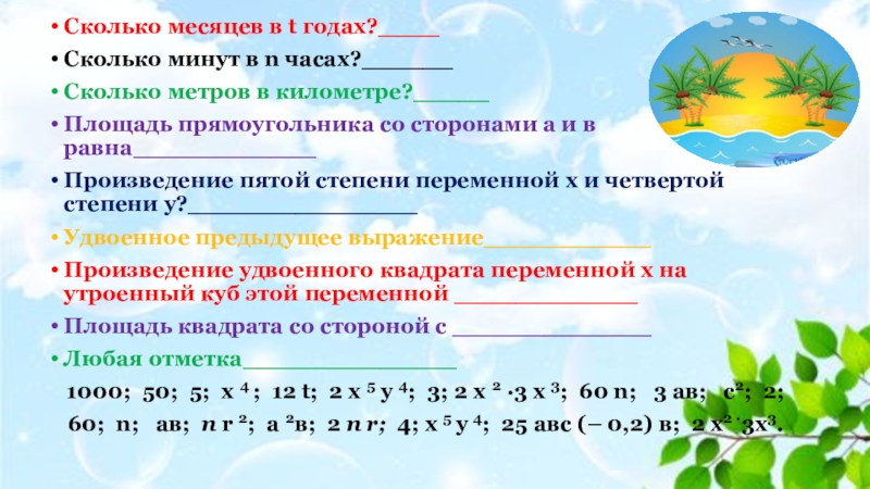 Сколько месяцев в t годах?____Сколько минут в n часах?______Сколько метров в километре?_____Площадь прямоугольника со сторонами а и
