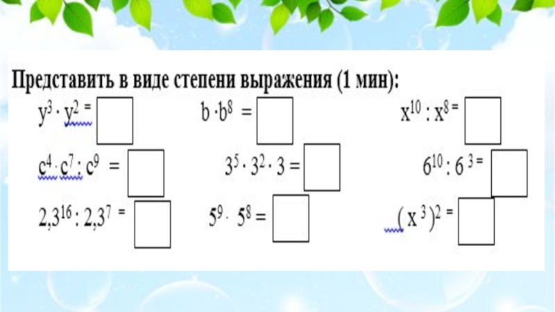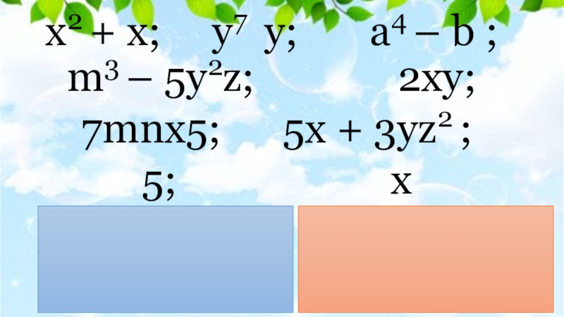 1000; 50; 5; x 4 ; 12 t; 2 x 5 y 4; 3; 2 x 2 ·3 x 3; 60 n; 3 ав; с2; 2;