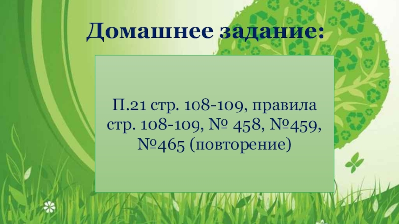 Домашнее задание:  П.21 стр. 108-109, правиластр. 108-109, № 458, №459, №465 (повторение)