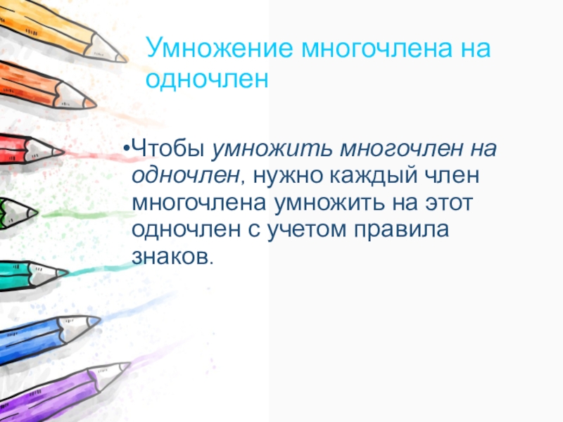 Умножение многочлена на одночленЧтобы умножить многочлен на одночлен, нужно каждый член многочлена умножить на этот одночлен с учетом правила