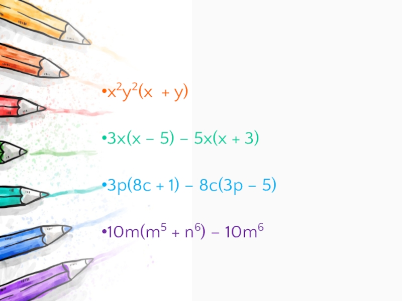 x2y2(x + y)3x(x – 5) – 5x(x + 3)3p(8c + 1) – 8c(3p – 5)10m(m5 + n6)