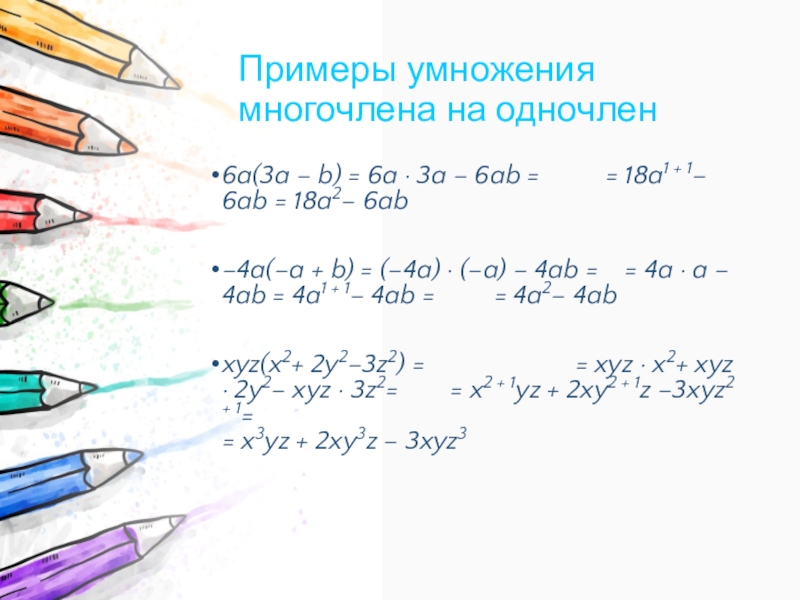 Примеры умножения многочлена на одночлен6a(3a − b) = 6a · 3a − 6ab =