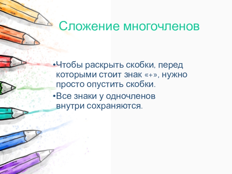 Сложение многочленовЧтобы раскрыть скобки, перед которыми стоит знак «+», нужно просто опустить скобки.Все знаки у одночленов внутри сохраняются.