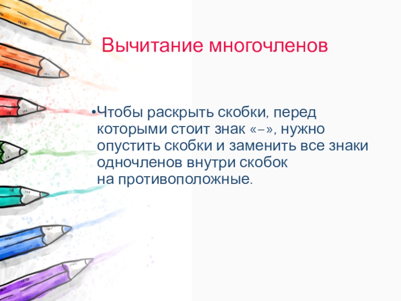 Вычитание многочленовЧтобы раскрыть скобки, перед которыми стоит знак «−», нужно опустить скобки и заменить все знаки одночленов