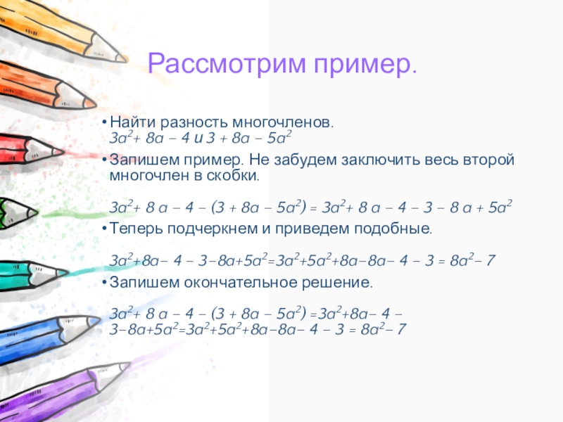 Рассмотрим пример.Найти разность многочленов. 3a2+ 8a − 4 и 3 + 8a − 5a2Запишем пример. Не забудем