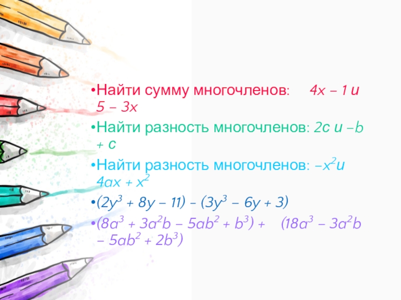 Найти сумму многочленов:   4x − 1 и 5 − 3xНайти разность многочленов: 2с и −b