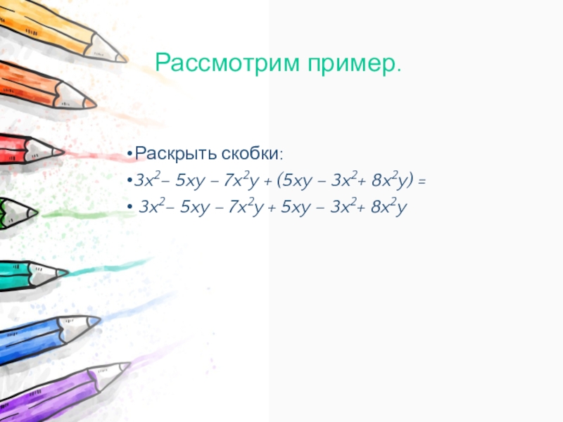 Рассмотрим пример. Раскрыть скобки:3x2− 5xy − 7x2y + (5xy − 3x2+ 8x2y) = 3x2− 5xy − 7x2y