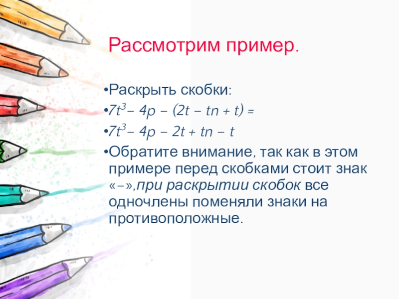 Рассмотрим пример.Раскрыть скобки:7t3− 4p − (2t − tn + t) = 7t3− 4p − 2t + tn