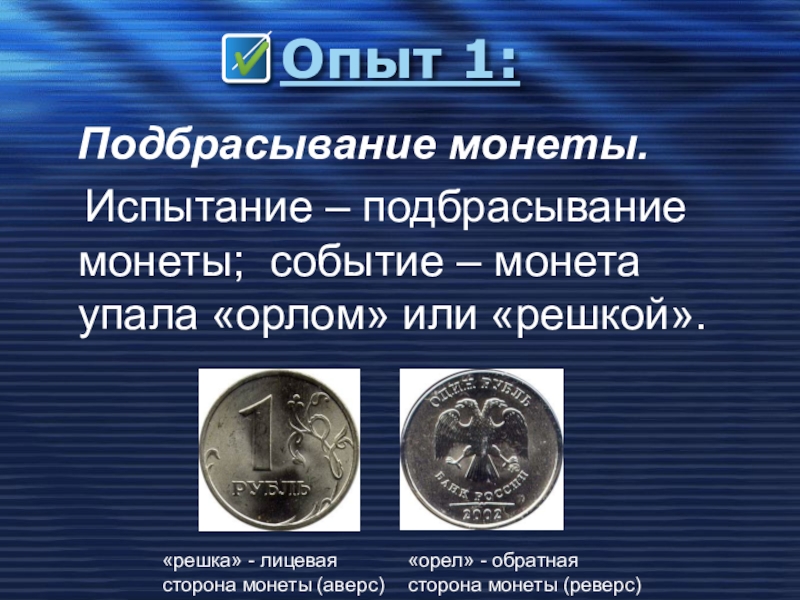 «решка» - лицевая сторона монеты (аверс)
