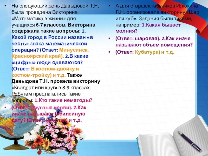 А для старшеклассников Илюхина Л.Н. организовала викторину «Шар или куб». Задания были такими, например: 1.Какая бывает молния?