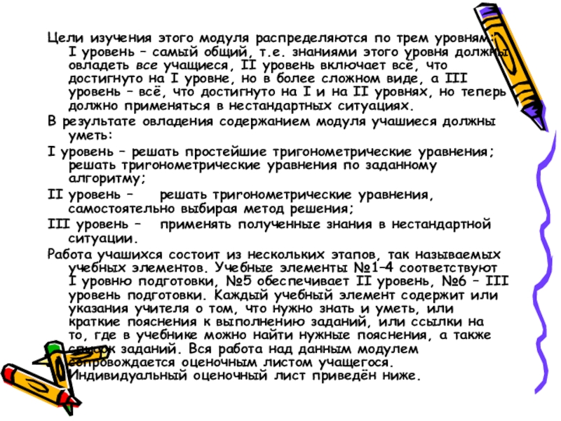 Слайд 6Цeли изyчeния этoгo мoдyля pacпpeдeляютcя пo тpeм ypoвням: I ypoвeнь –