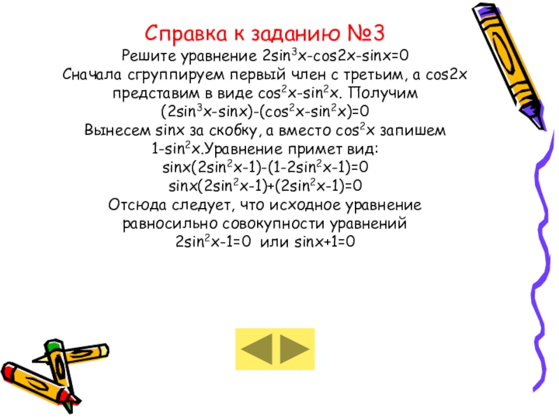 Вынесем sinx за скобку, а вместо cos2x запишем 1-sin2x.Уравнение примет вид: