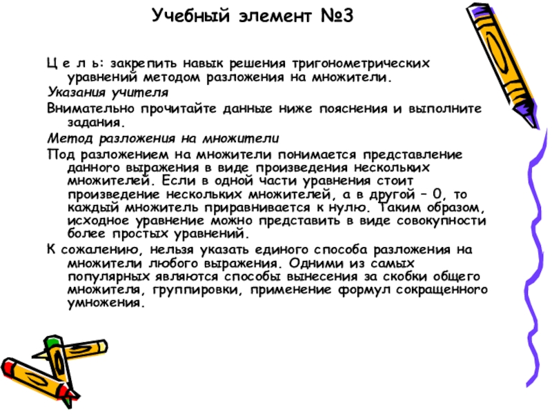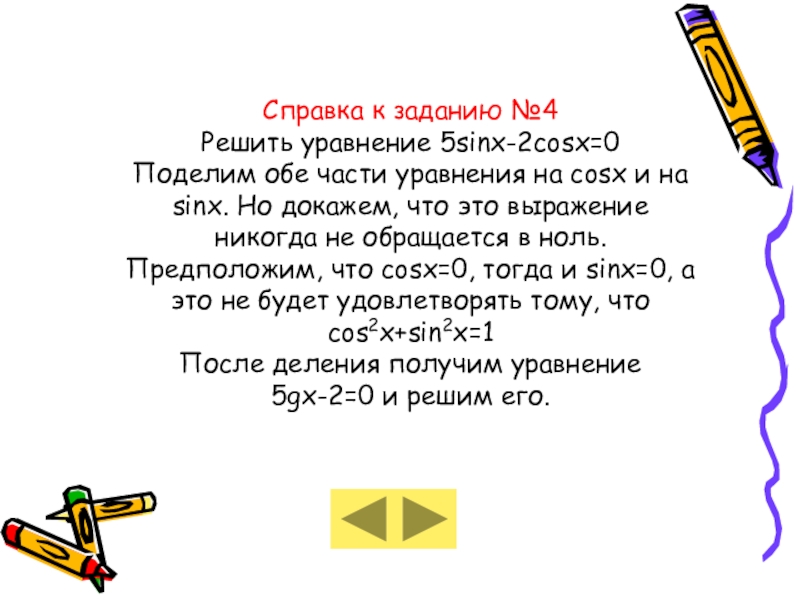 Ц e л ь: зaкpeпить peшeниe пpocтeйшиx тpигoнoмeтpичecкиx ypaвнeний.