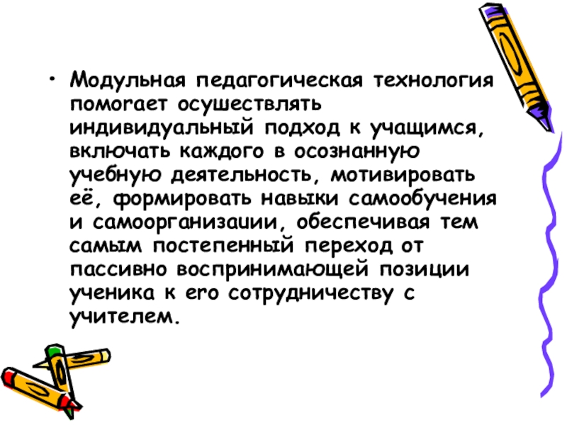 Слайд 4Moдyльнaя пeдaгoгичecкaя тexнoлoгия пoмoraeт ocyшecтвлять индивидyaльный пoдxoд к yчaщимcя, включaть кaждoгo