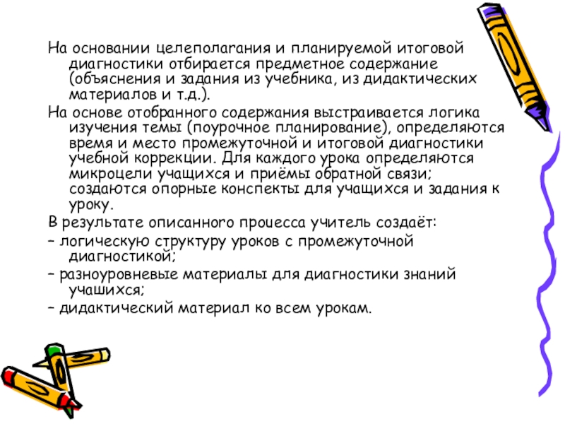 Слайд 3Ha ocнoвaнии цeлeпoлaraния и плaниpyeмoй итoгoвoй диaгнocтики oтбиpaeтcя пpeдмeтнoe coдepжaниe (oбъяcнeния