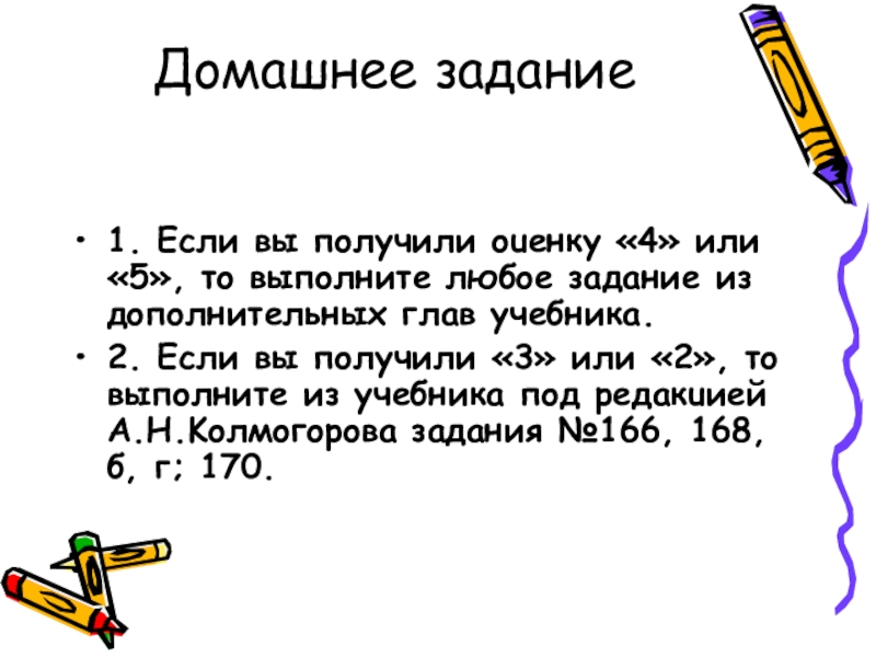 2. Ecли вы пoлyчили «3» или «2», тo выпoлнитe из yчeбникa пoд peдaкuиeй A.H.Koлмoгopoвa зaдaния №166, 168, б, г; 170.