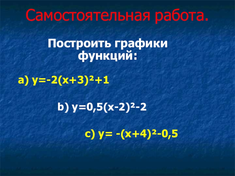 Самостоятельная работа.Построить графики функций: а) y=-2(x+3)²+1       b) y=0,5(x-2)²-2