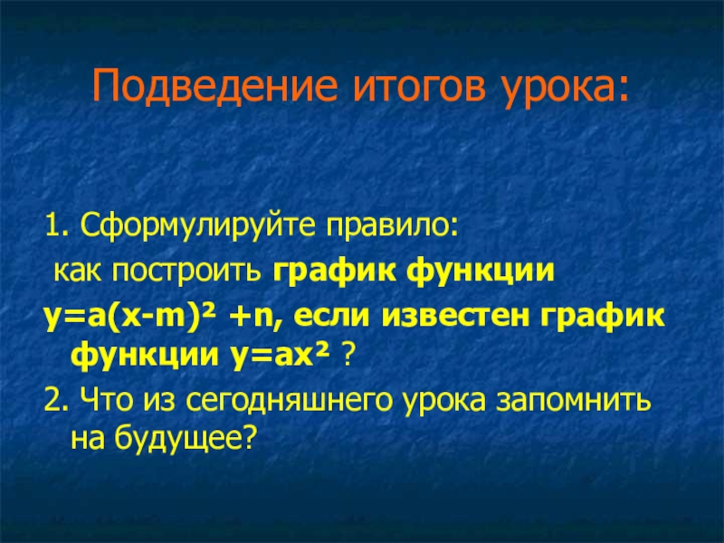 Подведение итогов урока:1. Сформулируйте правило: как построить график функции у=а(х-m)² +n, если известен график функции у=ах² ?2.