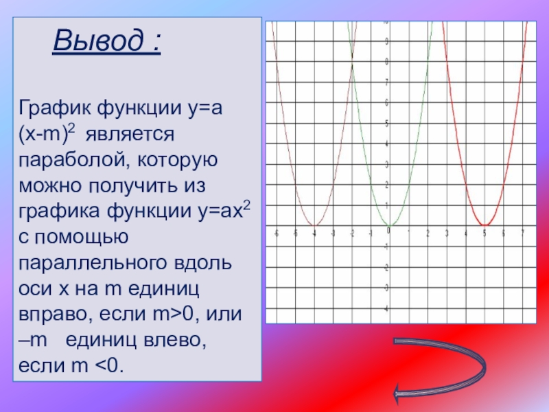 Вывод :График функции у=а(х-m)2 является параболой, которую можно получить из графика функции у=ах2 с помощью