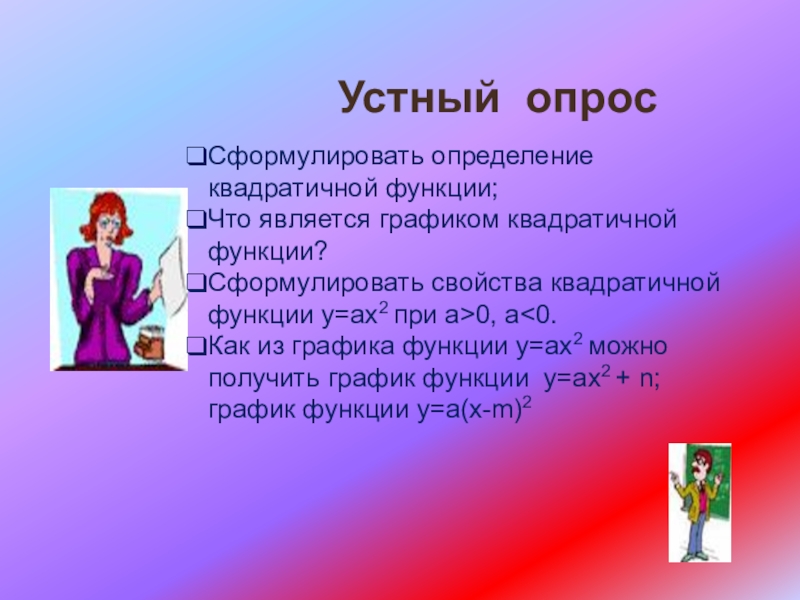 Устный опрос Сформулировать определение квадратичной функции;Что является графиком квадратичной функции?Сформулировать свойства квадратичной функции у=ах2 при а>0, a