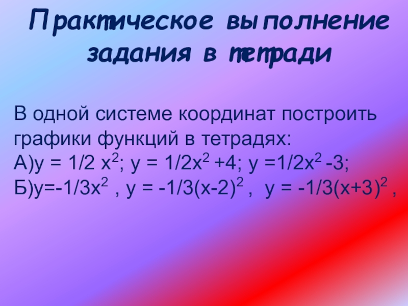 Практическое выполнение задания в тетрадиВ одной системе координат построить графики функций в тетрадях: А)у = 1/2 x2;