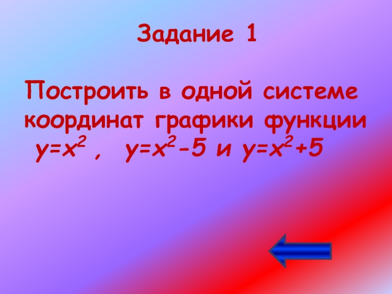 Задание 1Построить в одной системе координат графики функции y=x2 , y=x2-5 и y=x2+5