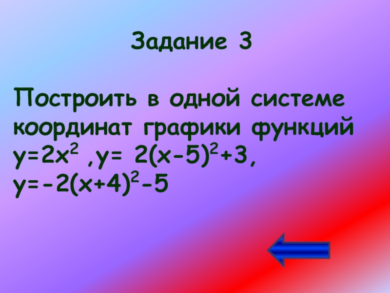 Задание 3Построить в одной системе координат графики функций у=2х2 ,у= 2(х-5)2+3, у=-2(х+4)2-5