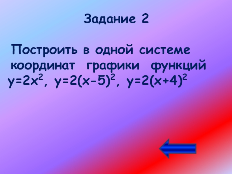 Задание 2Построить в одной системе координат графики функций у=2х2, у=2(х-5)2, у=2(х+4)2