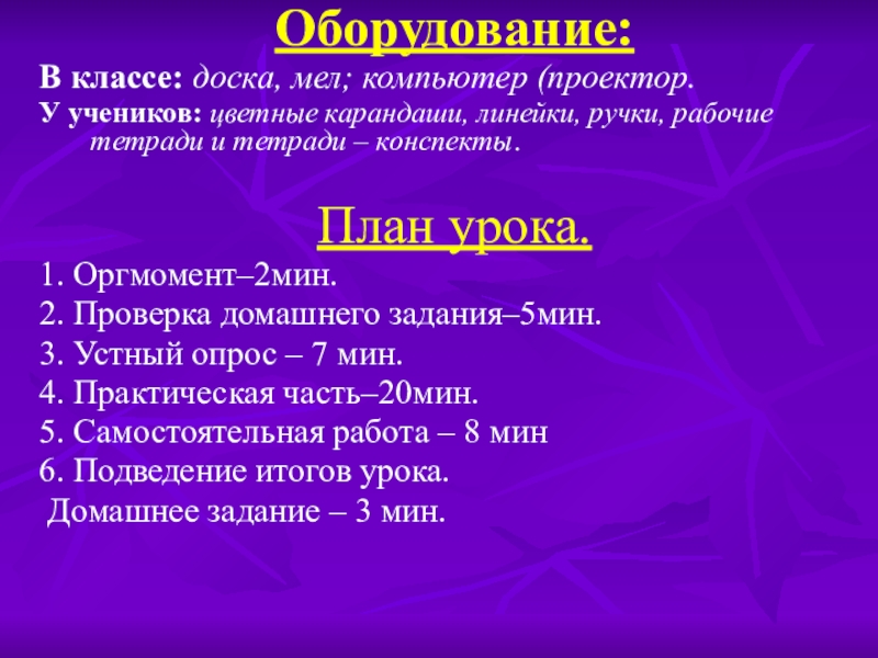 Оборудование: В классе: доска, мел; компьютер (проектор.У учеников: цветные карандаши, линейки, ручки, рабочие тетради и тетради –