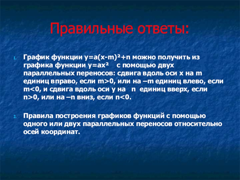 графика функции у=ах2 с помощью двух параллельных переносов: сдвига вдоль оси х на m единиц вправо, если m>0, или на –m единиц влево, если m<0, и сдвига вдоль оси у на n единиц вверх, если n>0, или на –n вниз, если n<0.
