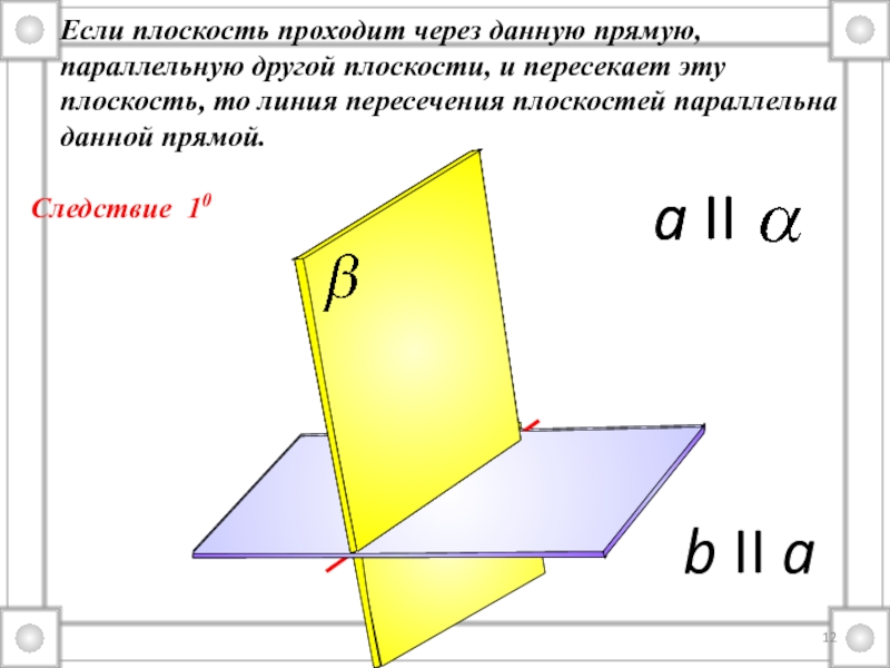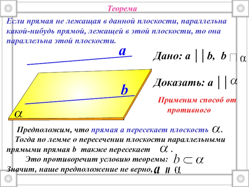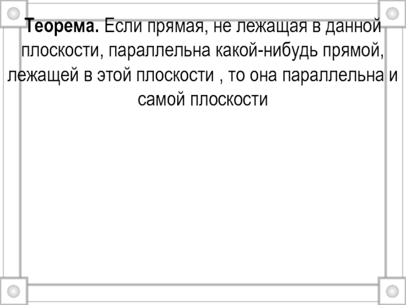 Если прямая не лежащая в данной плоскости, параллельна какой-нибудь прямой, лежащей в этой плоскости, то она параллельна этой плоскости.