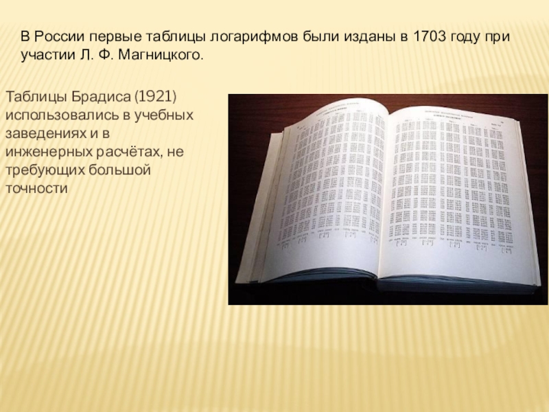 В России первые таблицы логарифмов были изданы в 1703 году при участии Л. Ф. Магницкого.