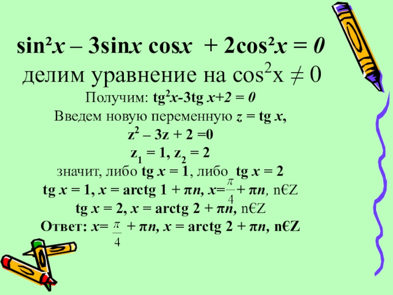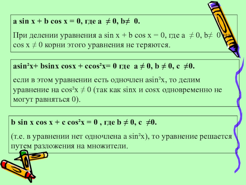 если в этом уравнении есть одночлен аsin²x, то делим уравнение на cos²x ≠ 0 (так как sinх и cosх одновременно не могут равняться 0).