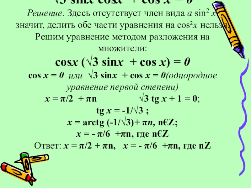 (т.е. в уравнении нет одночлена a sin²x), то уравнение решается путем разложения на множители.