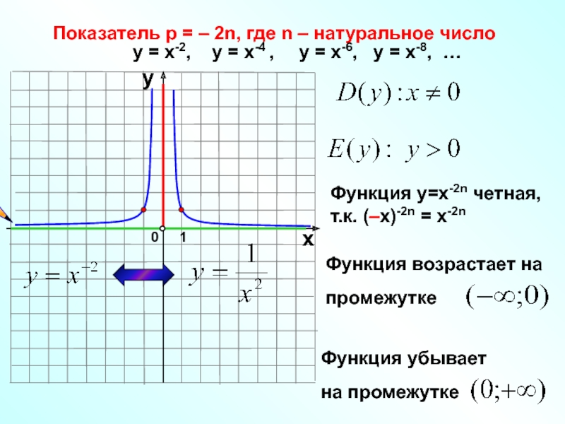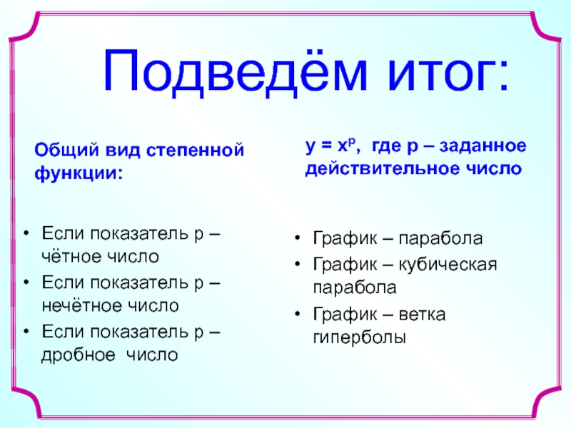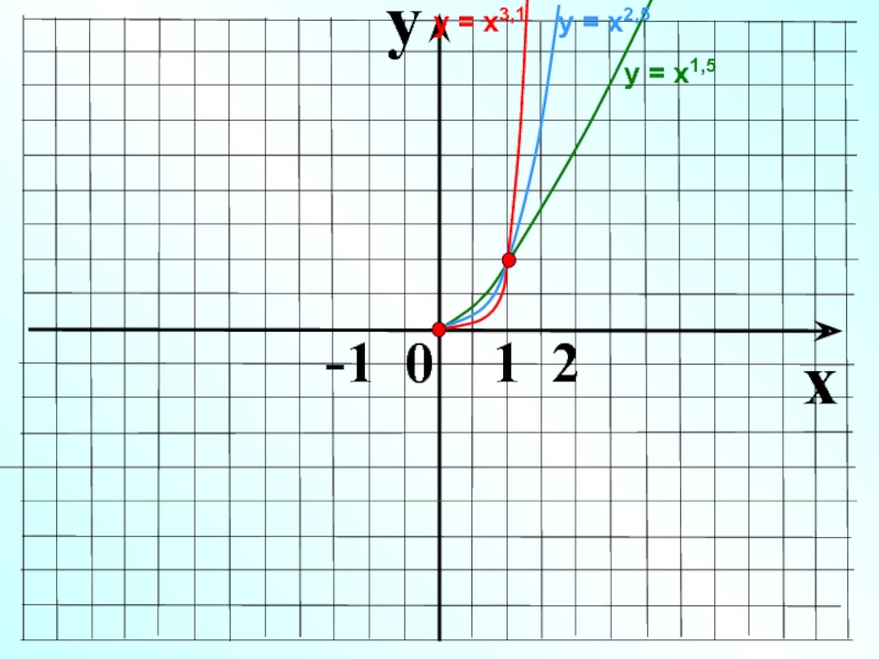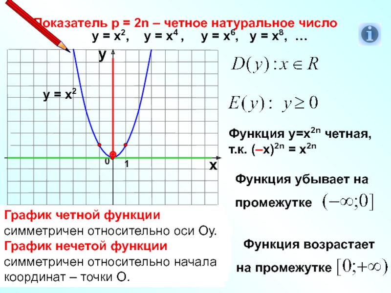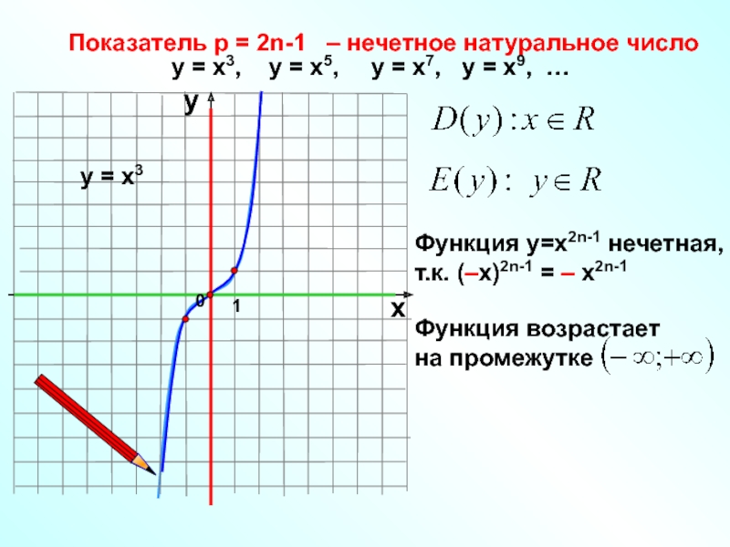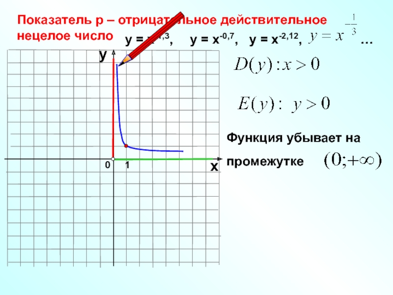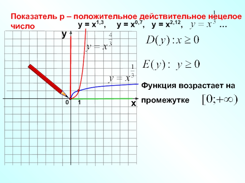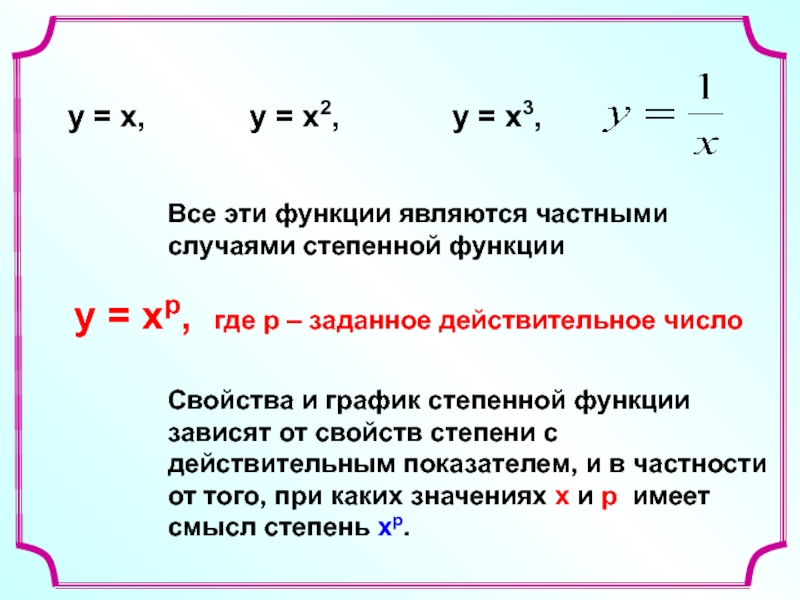Свойства и график степенной функции зависят от свойств степени с действительным показателем, и в частности от того, при каких значениях х и р имеет смысл степень хр.