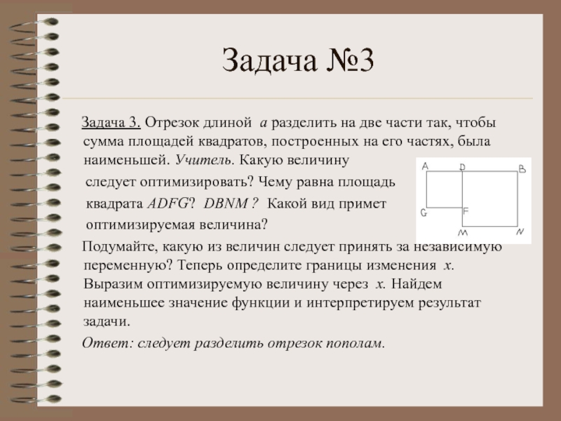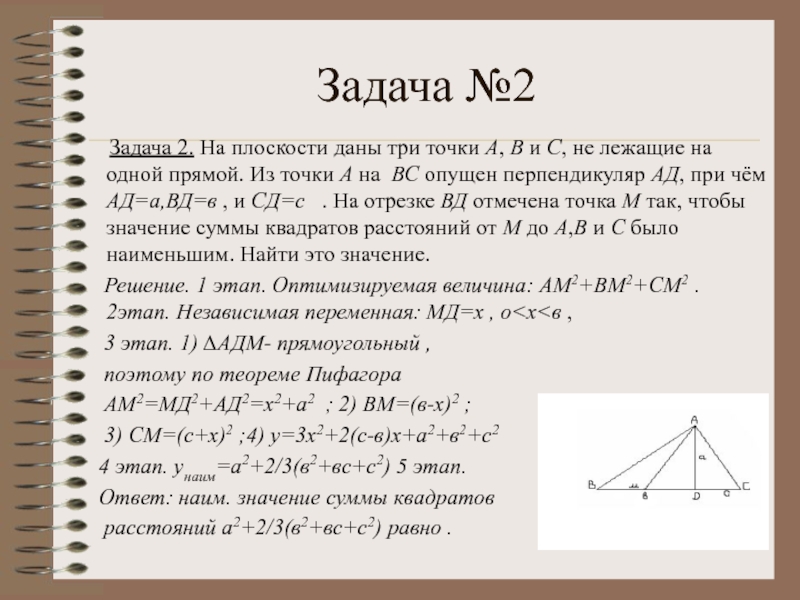 Решение. 1 этап. Оптимизируемая величина: АМ2+ВМ2+СМ2 . 2этап. Независимая переменная: МД=х , о<х<в ,