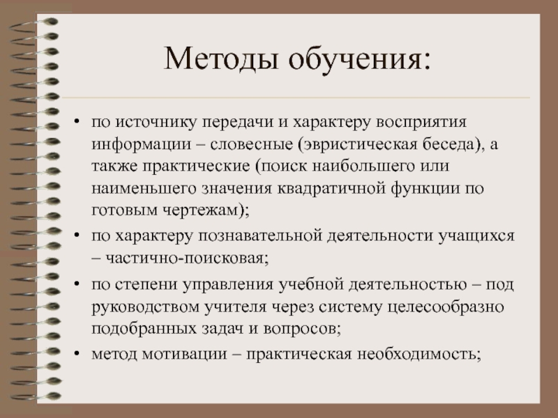 беседа), а также практические (поиск наибольшего или наименьшего значения квадратичной функции по готовым чертежам);