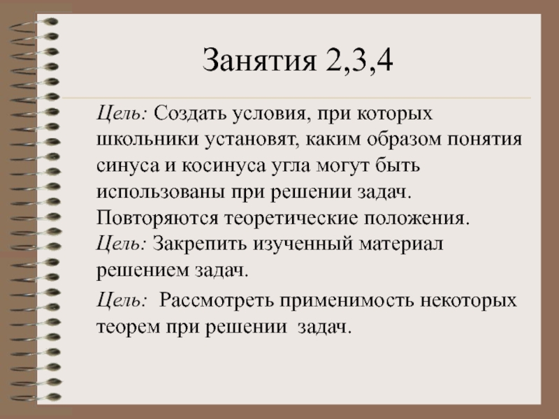 образом понятия синуса и косинуса угла могут быть использованы при решении задач. Повторяются теоретические положения. Цель: Закрепить изученный материал решением задач.