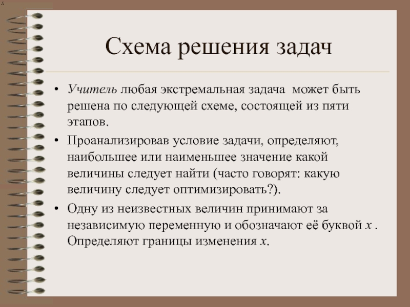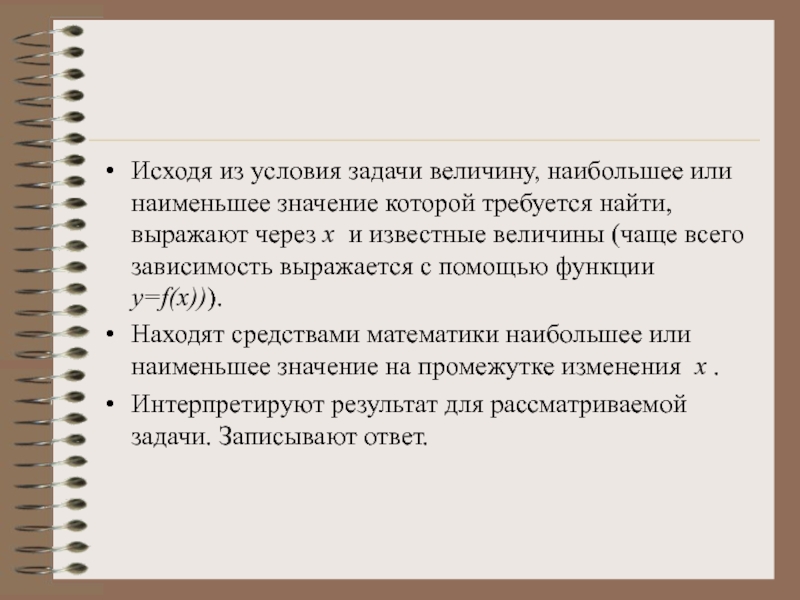 Проанализировав условие задачи, определяют, наибольшее или наименьшее значение какой величины следует найти (часто говорят: какую величину следует оптимизировать?).
