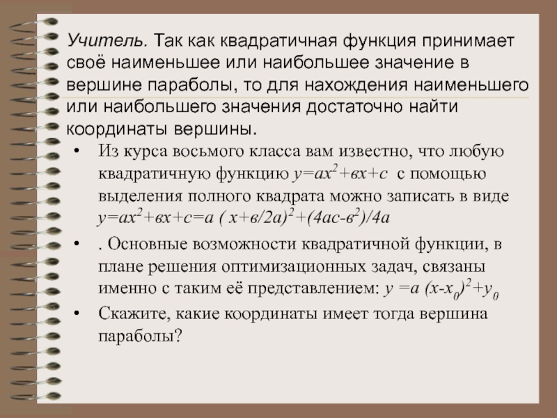 Учитель. Так как квадратичная функция принимает своё наименьшее или наибольшее значение в вершине параболы, то для нахождения наименьшего или наибольшего значения достаточно найти координаты вершины.