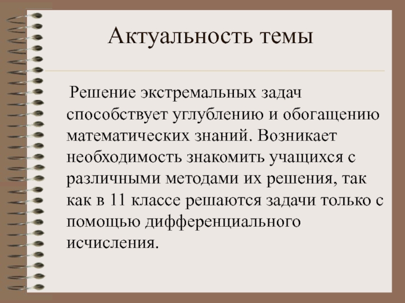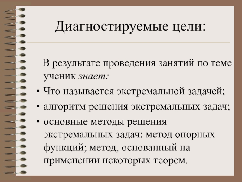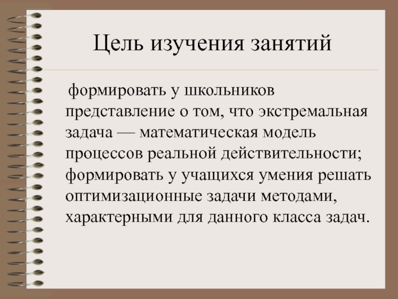 экстремальная задача — математическая модель процессов реальной действительности; формировать у учащихся умения решать оптимизационные задачи методами, характерными для данного класса задач.