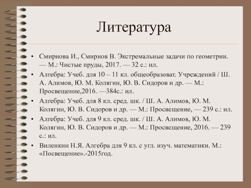 Алгебра: Учеб. для 9 кл. сред. шк. / Ш. А. Алимов, Ю. М. Колягин, Ю. В. Сидоров и др. — М.: Просвещение, 2016. — 239 с.: ил.