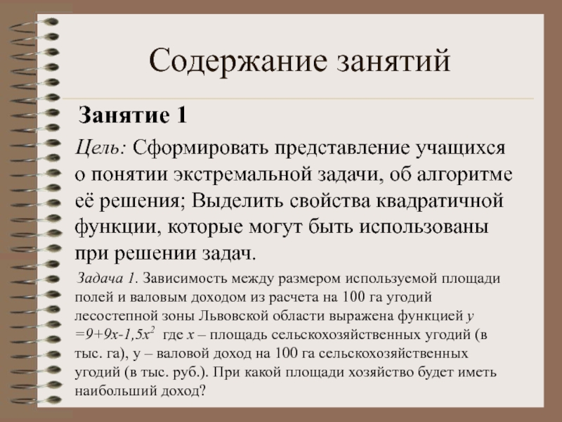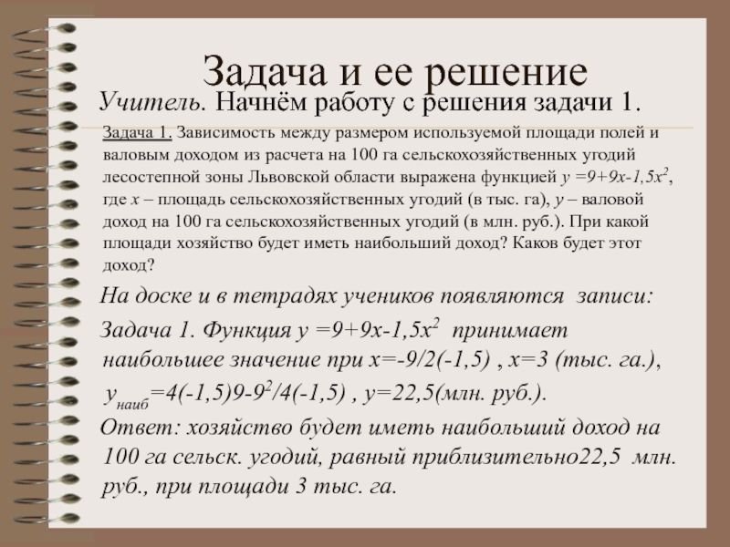 Задача 1. Зависимость между размером используемой площади полей и валовым доходом из расчета на 100 га сельскохозяйственных угодий лесостепной зоны Львовской области выражена функцией у =9+9х-1,5х2, где х – площадь сельскохозяйственных угодий (в тыс. га), у – валовой доход на 100 га сельскохозяйственных угодий (в млн. руб.). При какой площади хозяйство будет иметь наибольший доход? Каков будет этот доход?