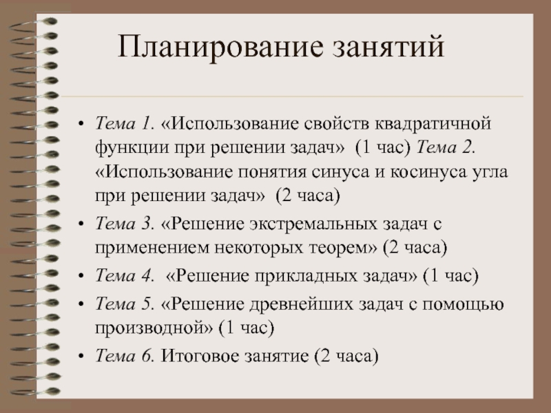 Задача Герона, задача Кеплера о вписанном цилиндре, задача Тартальи, задача Евклида о параллелограмме наибольшей площади, вписанном в треугольник. Перевод задач на математический язык, их решение основным методом.